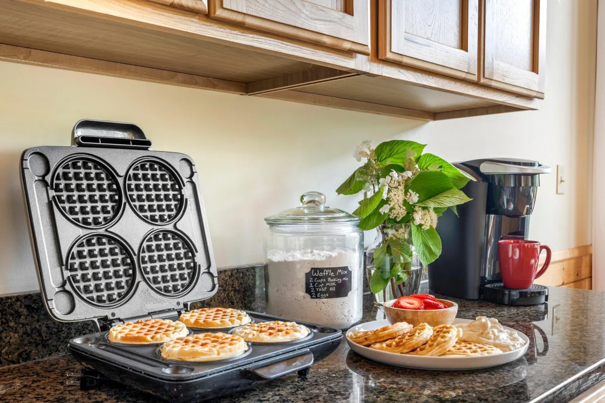 Keurig coffee maker available in the kitchen, with a waffle maker on the side if you’re in the mood for a cozy breakfast.